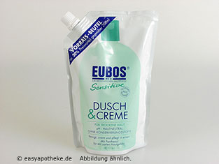 EUBOS Sensitive DUSCH & CREME enthält weder Farb- noch Konservierungsstoffe, ist pH-hautneutral sowie alkaliseifenfrei. Klinische Testergebnisse erbrachten den Nachweis, dass die Haut durch die Anwendung von EUBOS Sensitive DUSCH & CREME im Vergleich zu herkömmlichen Waschlotionen praktisch nicht entfettet wird und diesbezüglich ihr natürliches Gleichgewicht bewahrt. Dermatologisch auf Hautverträglichkeit getestet. Nach Rücksprache mit dem Arzt auch zur Reinigung und Pflege bei Hauterkrankungen geeignet.